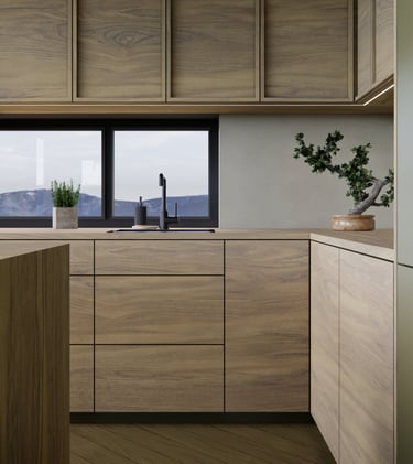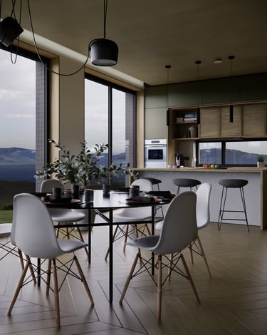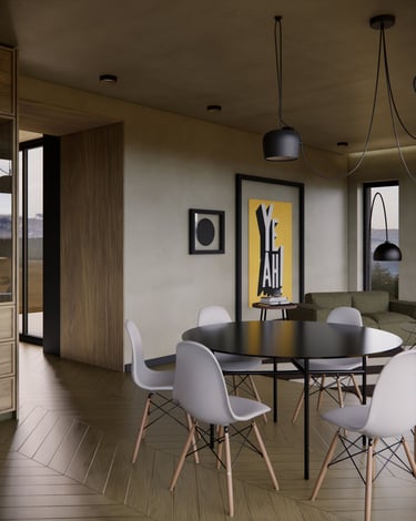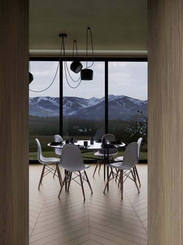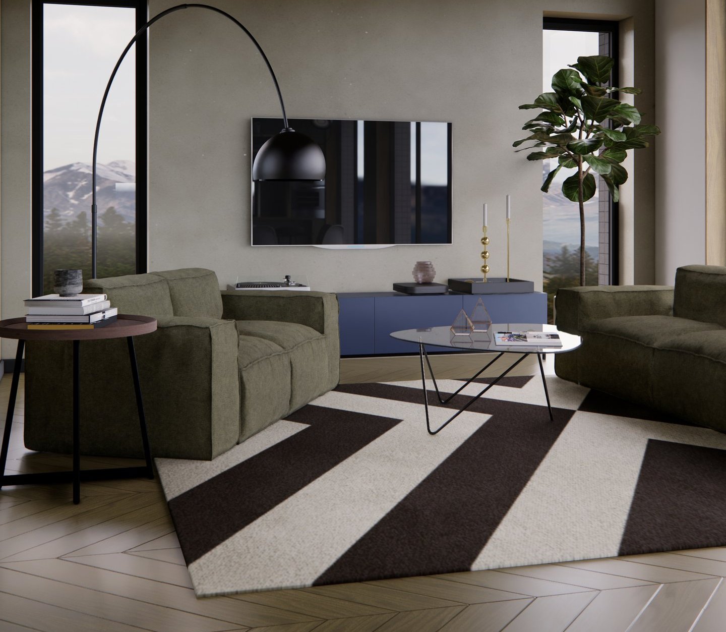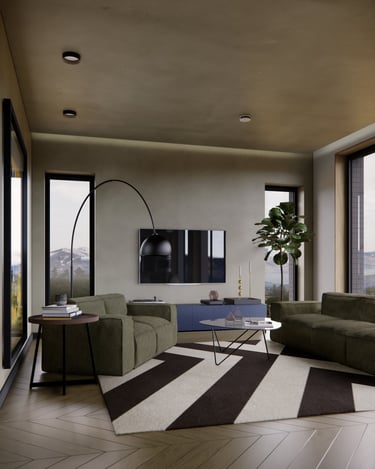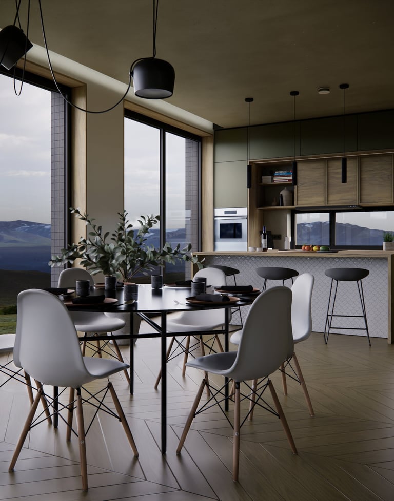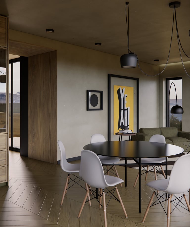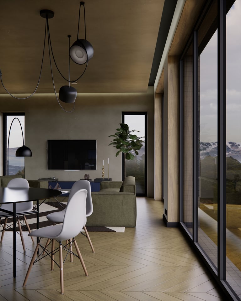 A combination of lights creates a balanced and layered lighting scheme. Chevron pattern flooring adds a refined texture and movement to the design. The black accents throughout the space provides contrast, preventing the neutral palette from feeling monotonous.
